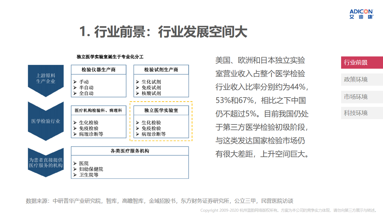 艾迪康医学检验中心有限公司是中国第三方医学检验行业的前三强之一。拥有临床、病理、生殖遗传、基因检测、临床试验5大中心实验室和研发中心,下设20多个专业临床实验室,提供2400余项检测项目,与全国近14000家医疗机构建立了合作,平均每日检测量达25万例 。共有17家实验室相继获得ISO15189认可,是中国独立第三方医学检验ISO15189认可通过率最高的企业。同时还获得了美国CAP认证、英国CEQAS质量体系评估及国内CMA资质认定等。